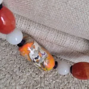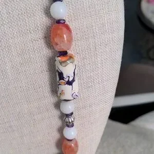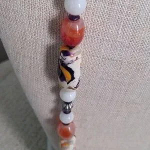 This elegant necklace features a combination of orange Agate white Quartz, and Purple Amethyst faceted roundels. Abstractly patterned handmade bead creates vibrant accents. Each artisan bead is one of a kind. Silver melon bead spacers. 32" long. Can be worn long or doubled as a choker.