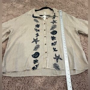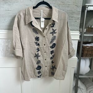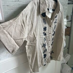 NWT new MEDIUM by Anthropologie button down linen shirt beach shell print tan
