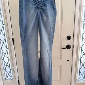 Dipped stomach ruching, flare jeans with a wide leg design. Long length for heals, I am 5’6”Perfect for boots or platforms. Unique!