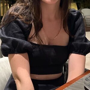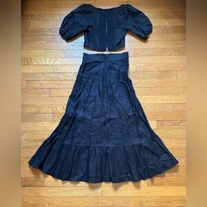 Elegant black midi skirt with a subtle flare. High-waisted silhouette. Smooth, flowing fabric. Versatile and timeless piece.