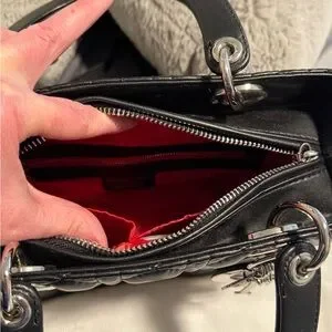 Stylish Dior satchel in black quilted leather. Features signature Dior charm and silver-tone hardware. Structured silhouette for polished looks. Versatile piece for day or evening wear.