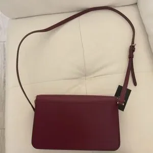 Structured leather crossbody in rich burgundy. Sleek flap front with subtle kate spade logo. Detachable adjustable strap for versatile wear. Gold-tone hardware adds polished detail.