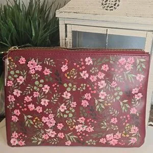 Beautiful burgundy floral zip pouch featuring pink flower accents and gold foil scripture text. Compact and stylish for organizing stationery and small office essentials. Durable construction with a smooth zipper closure. The burgundy color and floral design add a feminine, elegant touch.