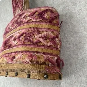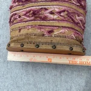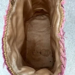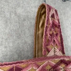 VTG Handmade Burlap Yarn Embroidered Tote Bag Geometric Stitched Pink Brown Boho