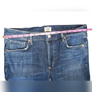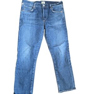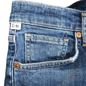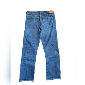 Emerson slim boyfriend jeans. Comfortable stretch denim with a mid-blue wash. Versatile everyday style that pairs easily with tees or shirts. Button fly.
