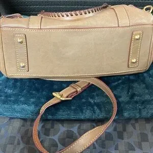 Chic tan leather satchel with braided handles. Features gold-tone hardware and adjustable strap. Ideal for versatile styling. This is a great bag, like new condition. Italian leather, soft and supple, this is a great bag!