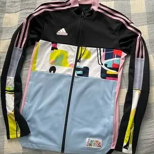 Adidas track jacket with bold graphic design. Features black, pink, and light blue colors. Unique style with vibrant accents.