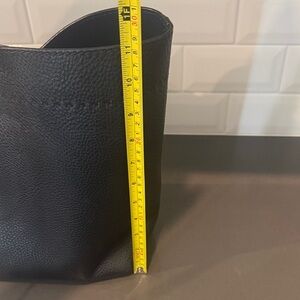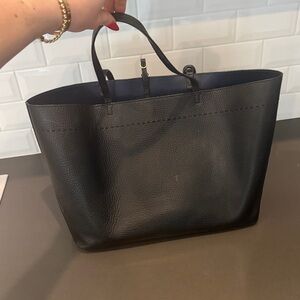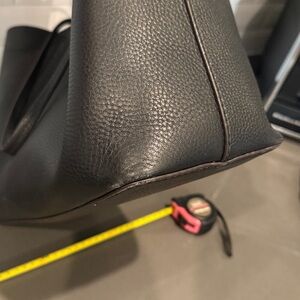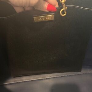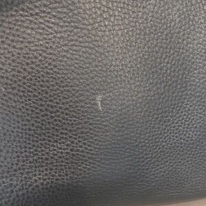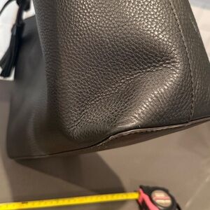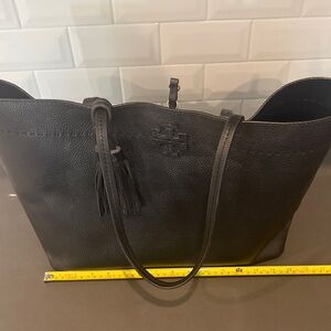 Chic Tory Burch tote in black pebbled leather. Features tassel accents and signature logo. Perfect for versatile styling. I used a leather conditioner on it and it left a white cast - you might be able to cover it up with black shoe polish
