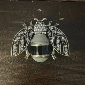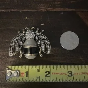 Sparkling bee brooch with crystal-studded wings. Black and pearl striped enamel body with gold-tone accents. Elegant and eye-catching accessory.