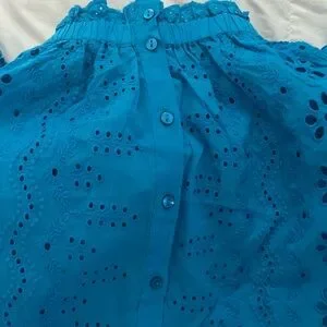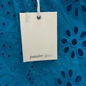this is a bright blue eyelet ruffled short sleeve blouse from the brand Jennifer & Grace.