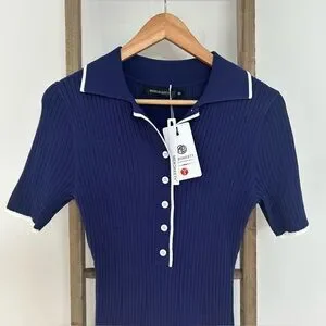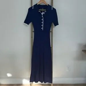 Merokeety Ribbed Knit MIDI Polo Dress Blue Button V-Neck Size S NWT Old Money