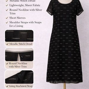 Mihael Stars black sheer shift dress featuring subtle metallic stripe detailing and a classic, easy-to-wear silhouette. Lightweight and versatile, this piece is perfect for layering and can be styled with a slip, camisole, or leggings for day or evening wear.