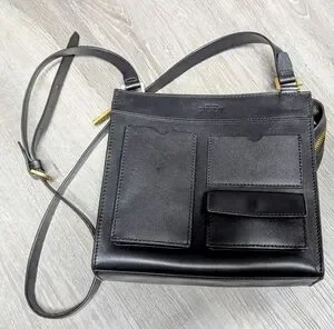 Black leather, unlined, multiple outside pockets, long adjustable strap.