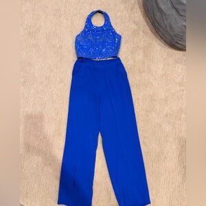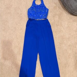 Stylish blue sequin crop top paired with coordinating blue wide-leg pants. The set offers a modern silhouette with a sparkling top and comfortable, tailored pants. Ideal for events and nights out. Blue adds a bold, elegant touch.