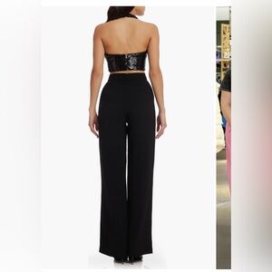 Shimmering sequins catch the light on a glamorous cropped halter top that is paired with stunning wide-leg pants.