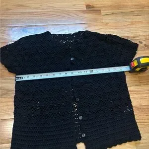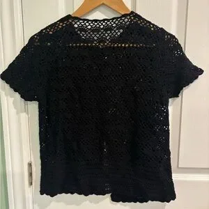 Lightweight black crochet short-sleeve cardigan with front buttons. Breathable open-knit design for layering over tops or dresses. Fits women’s size S-M (measurements in photos). Excellent condition.