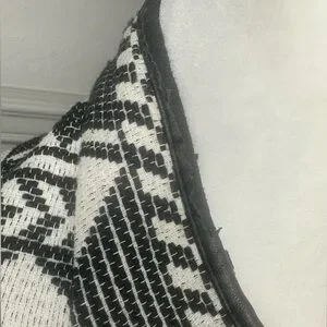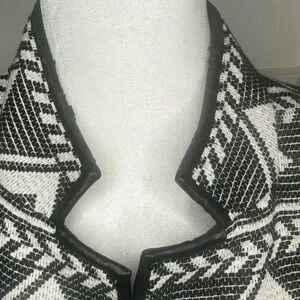 This Zara cape features a striking black-and-white geometric pattern, offering a chic and modern look. Its open front and relaxed fit make it a versatile addition to any wardrobe, perfect for layering over casual, Bohemian, or dressy outfits.