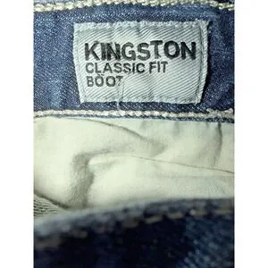Express Jeans Kingston Classic Fit Boot jeans in a medium wash blue denim. Men’s size 32x32 with a classic fit and bootcut leg, finished with subtle fading and whisker details for a broken-in everyday look.