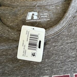 Russell Athletic short-sleeve tee with collegiate chest graphic. Front reads "Iowa State Cyclones" with team logo. Comfortable casual style in heathered gray fabric.