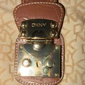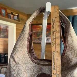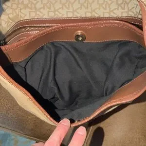 Sophisticated DKNY shoulder bag with monogram design. Features beige and brown tones. Ideal for everyday elegance.