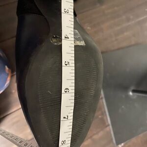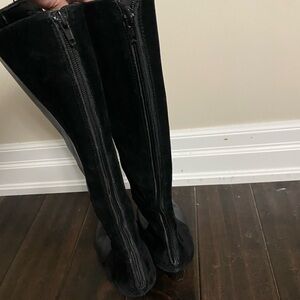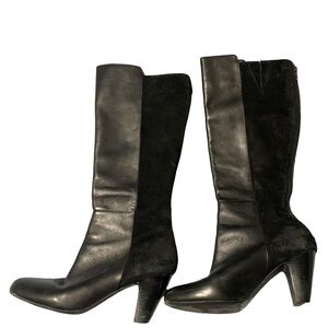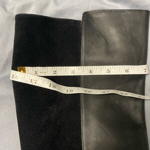 These are pre-owned BCBG Max Azria black leather and suede knee-high boots. They feature a back zipper closure, a 3 inch heel, and a pointed toe. The boots are in good condition with some minor wear and tear on the soles and heels. The boots are approximately 19 inches in length from the heel to the top of the boot. The boots are a size 9.5B