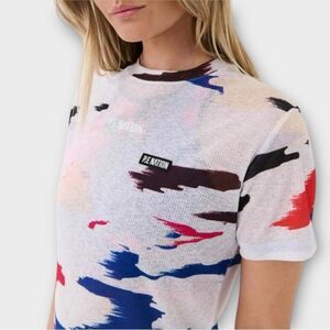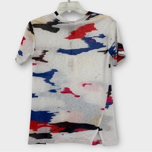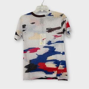 Lightweight short sleeve tee with abstract paint-style/ camouflage print. Crew neckline & fitted silhouette