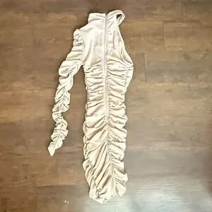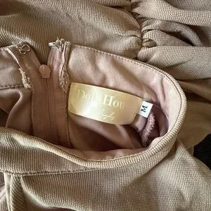 Chic one shoulder design with ruched detailing. Perfect for stylish outings. Tan with a pink blush tone