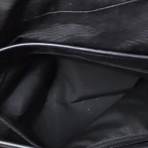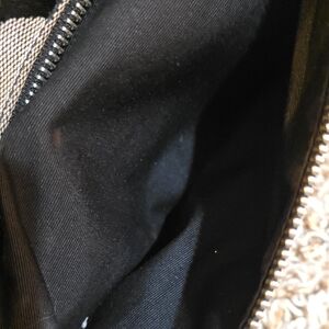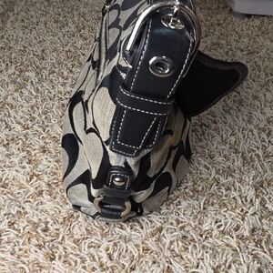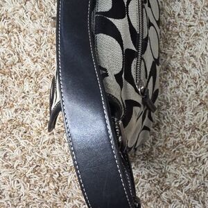 Stylish black and beige shoulder bag with a signature monogram print. Smooth black trim and hardware for a polished look. Compact and versatile for everyday wear. Includes flap closure for secure carrying. Was barely used. The inside of the bag is in excellent condition. Measures approximately 13" wide and 8" tall. There are a couple stains which are showed in the photos.