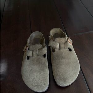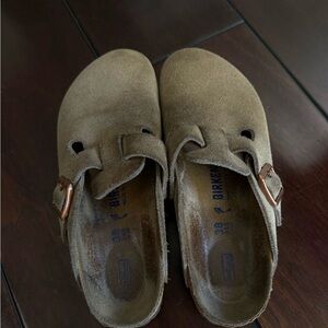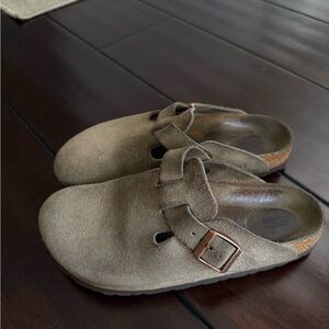 Olive suede slip-on clogs. Single adjustable rose-gold buckle. Soft suede upper with cork footbed. Easy on-and-off design. Neutral casual look.