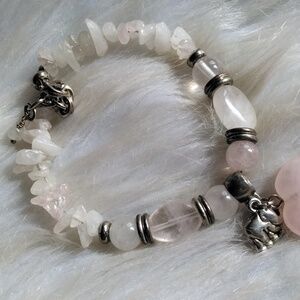 Delicate rose quartz bracelet featuring a heart pendant and silver-tone accents. Soft pink stones create a feminine, calming look. Versatile piece that complements everyday and dressy outfits.
