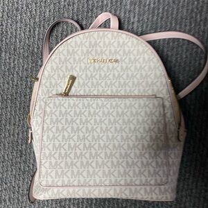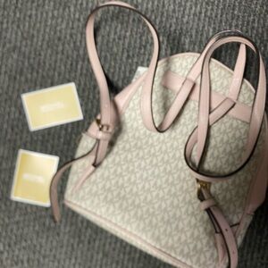 Matching Michael Kors set featuring signature MK logo print. Includes a mini backpack and a compact crossbody. Pale pink trim and gold-tone hardware. Clean, versatile styles for daily use.