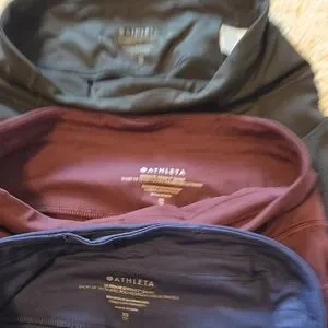 Three Athleta active shorts in solid colors. Soft, performance knit fabric. Comfortable waistband detail. Versatile for gym or casual wear.