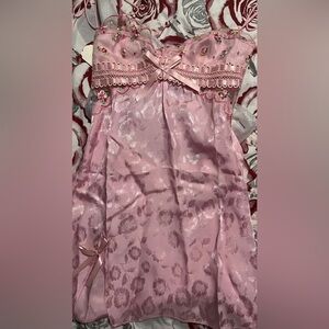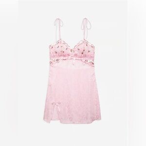 Charming pink chemise with floral embroidery. Features delicate lace accents. Ideal for a stylish night's sleep.