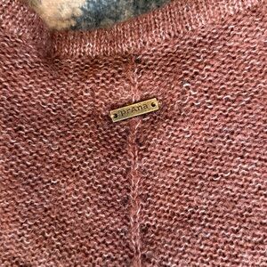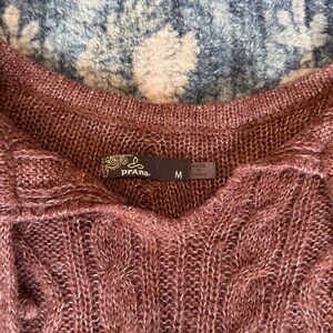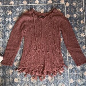 Prana long sleeve cable knit sweater with tassel fringe hem. Light burgundy.