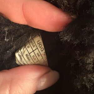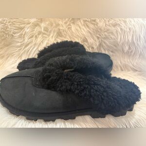 UGG slippers in black. Plush shearling trim and lining for warmth. Durable rubber traction soles. Easy pull-on style for everyday wear. Pre-owned. Women’s size 8.