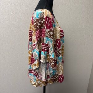 Cato Boho Patchwork Peasant Top Smocked Neck Bell Sleeve Floral Print L