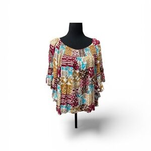 Beautiful Cato boho patchwork peasant top featuring a colorful mix of mustard, burgundy, teal, and cream floral & geometric prints. Designed with a stretchy smocked neckline, flowy silhouette, and feminine tiered bell sleeves for a relaxed, flattering fit.