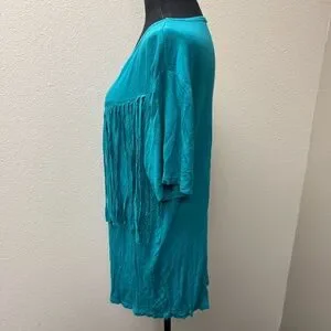 Crazy Train Teal Fringe Western Boho Top Festival Southwest Tee Size L