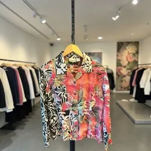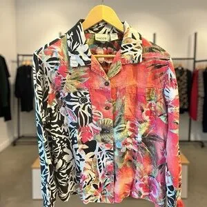 Chico's floral tropical button-up shirt. Bold mix of coral, pink, teal and black with zebra-inspired panels. Lightweight, breezy fabric. Statement piece for casual or vacation wear.