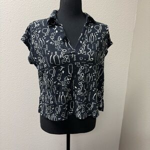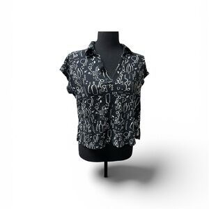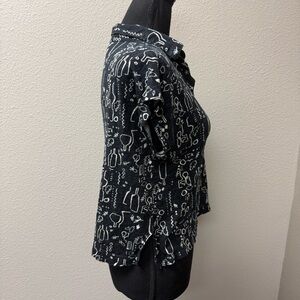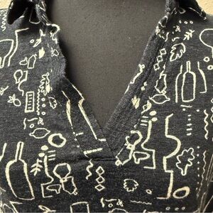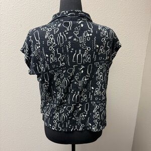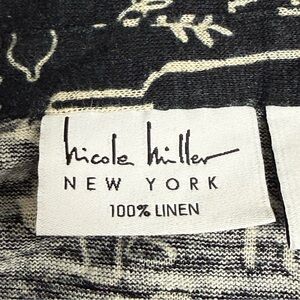 Nicole Miller Linen Top Black White Print V Neck Blouse Lightweight Size L