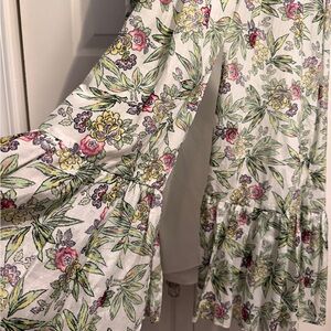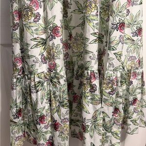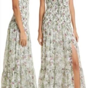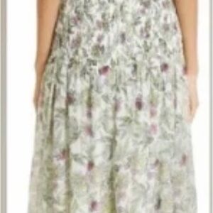It is characterized by an artful floral print and a construction from a luxurious blend of 70% cotton and 30% silk. The design features a smocked midsection that creates a flattering silhouette, leading into an A-line tiered skirt.
