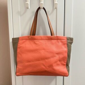 Marc by Marc Jacobs leather tote with coral center panel and brown side panels. Brown leather shoulder straps. Pebbled leather texture and simple, structured shape. Subtle gold logo hardware at front. Easy everyday carry with a modern colorblock look.