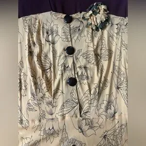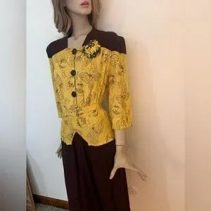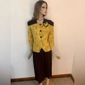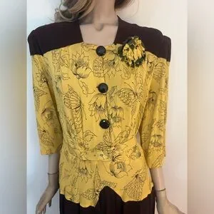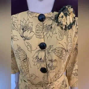 golden yellow poly rayon blend fabric that has a nice give to it, featuring a butterflies and a floral pattern then complemented by a dark chocolate, brown crêpe, solid fabric for the body of the dress. Beautiful diamond cut buttons at the front, featuring a matching corsage and a matching belt. There are a few spots at the bodice as shown in the pictures. There are two faint ones below the corsage and one on the right side bodice at the front in the butterfly. They are not terribly noticeable due to the fabrics print and may remove with a cleaning.Approximate measurements Bust 38 waist 34. Smoke free pet free home, This could be your new old one of a kind finds! (Hat not included but will be listed)