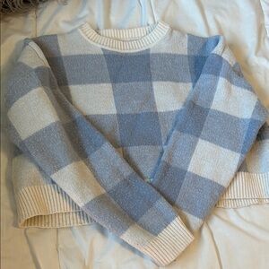 Stay cozy and stylish with this plaid sweater in soothing blue and cream tones. Perfect for layering in cooler weather.