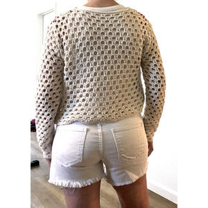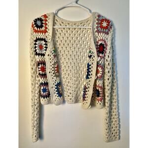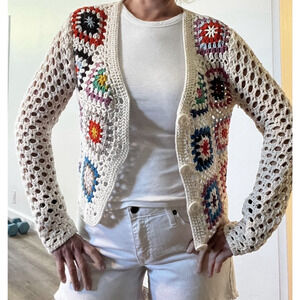 Crochet Colorful Granny Square Cardigan Womens M Boho Festival Ivory Crop Button