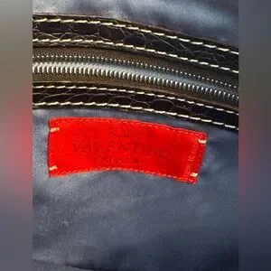 This bag features a patent leather snap closure, a signature ‘V’ logo applique and silver tone hardware. The interior is lined with puple satin and has a zipper pocket with a Valentino red leather label.