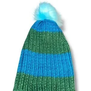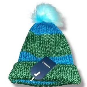 Hat Attack Happy Stripes Beanie Hat Blue Green Knit Faux Fur Pom-Pom OS Winter