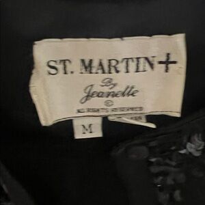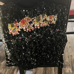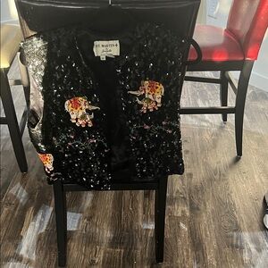 black pea coat with sequined front and colorful elephant embroidery. Eye-catching sequin detail adds shine. Decorative embroidered elephants create a unique, playful look. Easy to style for evenings and special events.
