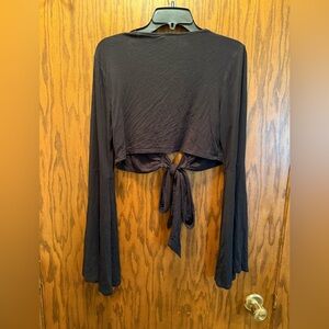 Elevate your style with this chic black tie-front top. Featuring elegant bell sleeves and a flattering fit, it's perfect for any occasion. Has studs.