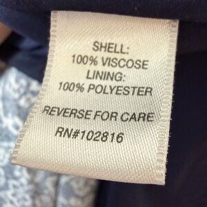 Crepe navy blue with white botanical floral print. Midi length. Fully lined. Elastic waist. Pockets. Flowy.